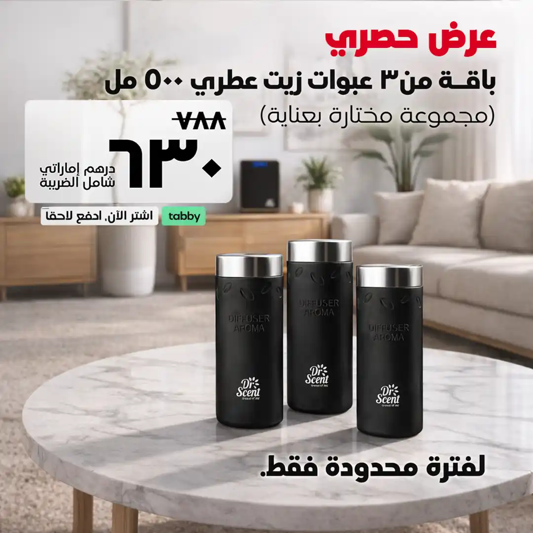 جدد مساحتك مع عرضنا المميز لمجموعة 500 مل – احصل على أي 3 زيوت عطرية سعة 500 مل بسعر 630 درهمًا إماراتيًا فقط.