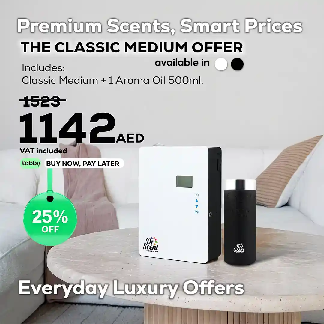 Experience luxury fragrance innovation with the Dr Scent Classic Diffuser Offer featuring 1 x 500ml premium aroma oils. Designed with Cold Air Diffusion Technology, this diffuser evenly distributes fragrance across large areas up to 400m², making it ideal for homes, offices, hotels, and commercial spaces.