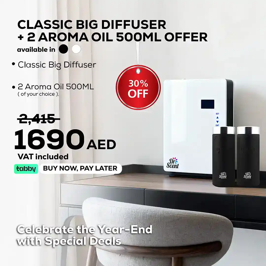Experience luxury fragrance innovation with the Dr Scent Classic Diffuser Offer featuring 2×500ml premium aroma oils. Designed with Cold Air Diffusion Technology, this diffuser evenly distributes fragrance across large areas up to 800m², making it ideal for homes, offices, hotels, and commercial spaces.
