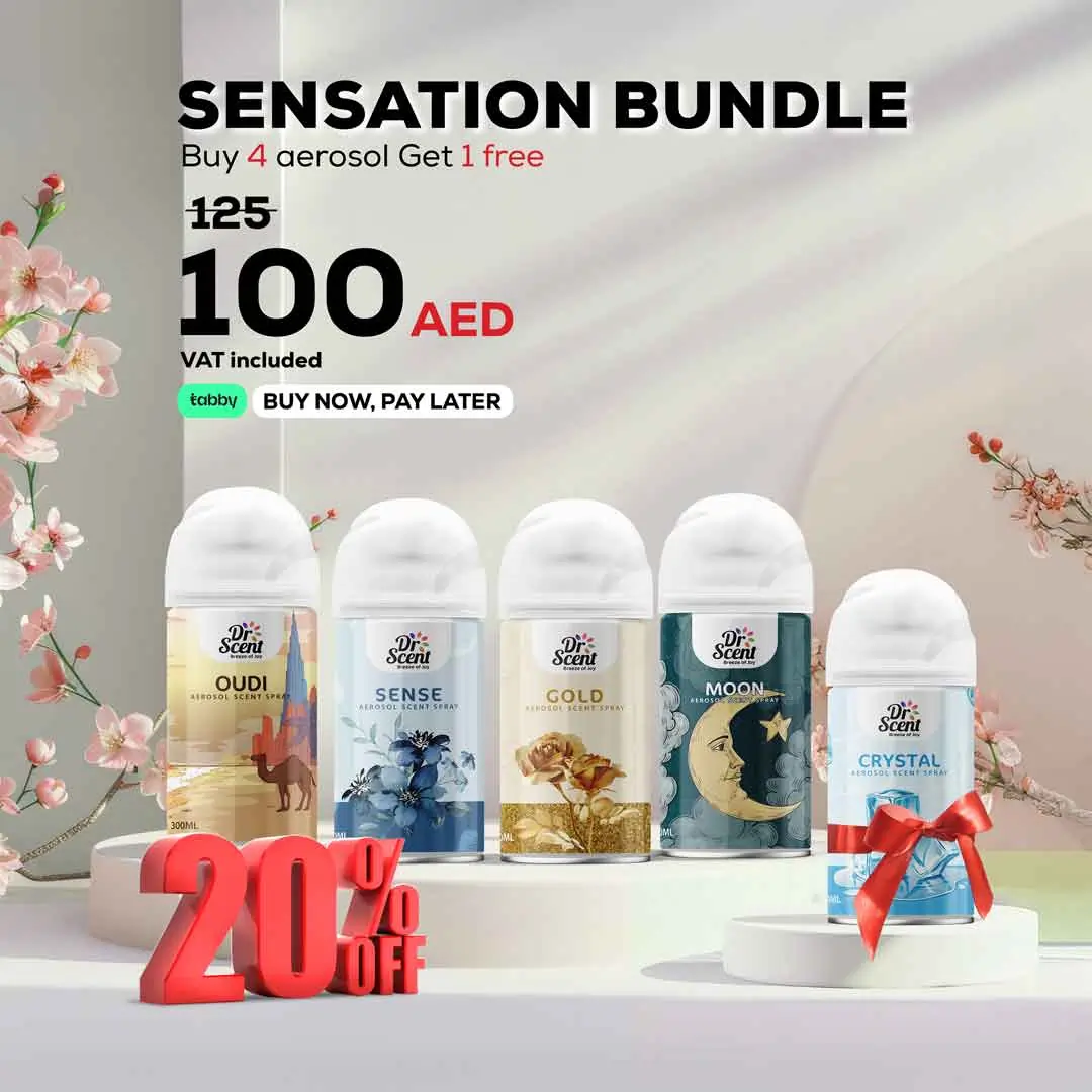 Elevate your home’s ambiance with our Scent Sensation Bundle. Enjoy this package of 5 premium aerosol scent sprays 300 ml of your choice, now for only 105 AED when you get this deal.